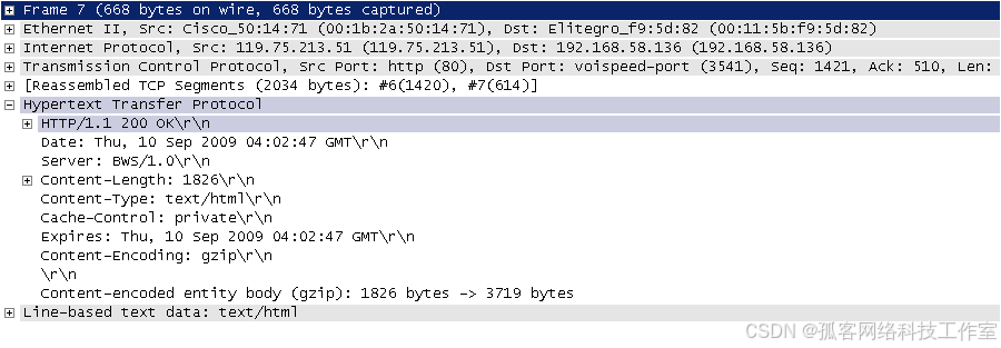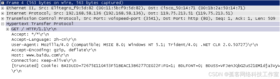 下图是我在四川省网络通信技术重点实验室工作期间用开源协议分析工具 Ethereal(WireShark 的前身)截取的访问百度首页时的 HTTP 请求和响应的报文(协议数据),由于 Ethereal 截取的是经过网络适配器的数据,因此可以清晰的看到从物理链路层到应用层的协议数据。
