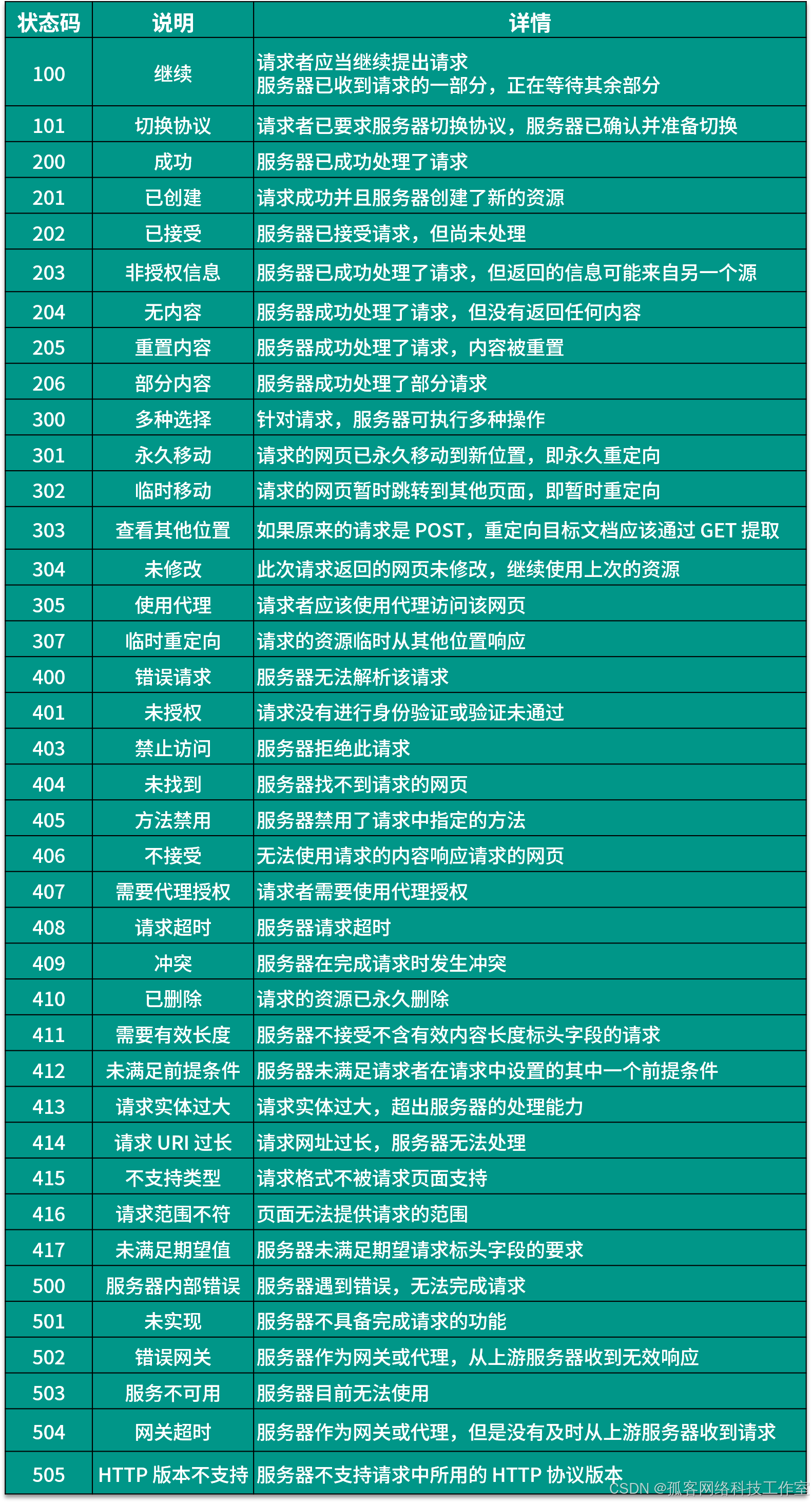 HTTP 响应通常是由响应行、响应头、空行、消息体四个部分构成,其中消息体是服务响应的数据,可能是 HTML 页面,也有可能是JSON或二进制数据等。响应行中包含了协议版本和响应状态码,响应状态码有很多种,常见的如下表所示。