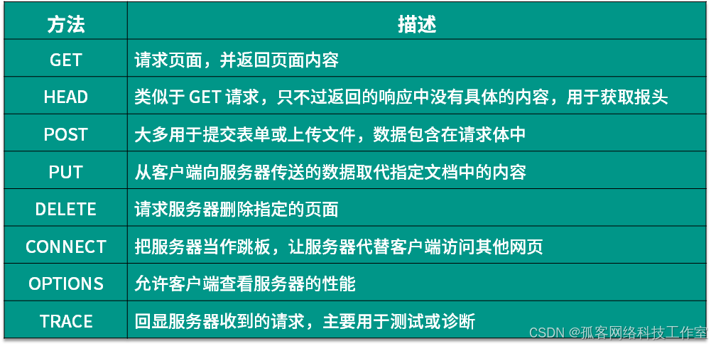 HTTP 请求通常是由请求行、请求头、空行、消息体四个部分构成,如果没有数据发给服务器,消息体就不是必须的部分。请求行中包含了请求方法(GET、POST 等,如下表所示)、资源路径和协议版本;请求头由若干键值对构成,包含了浏览器、编码方式、首选语言、缓存策略等信息;请求头的后面是空行和消息体。